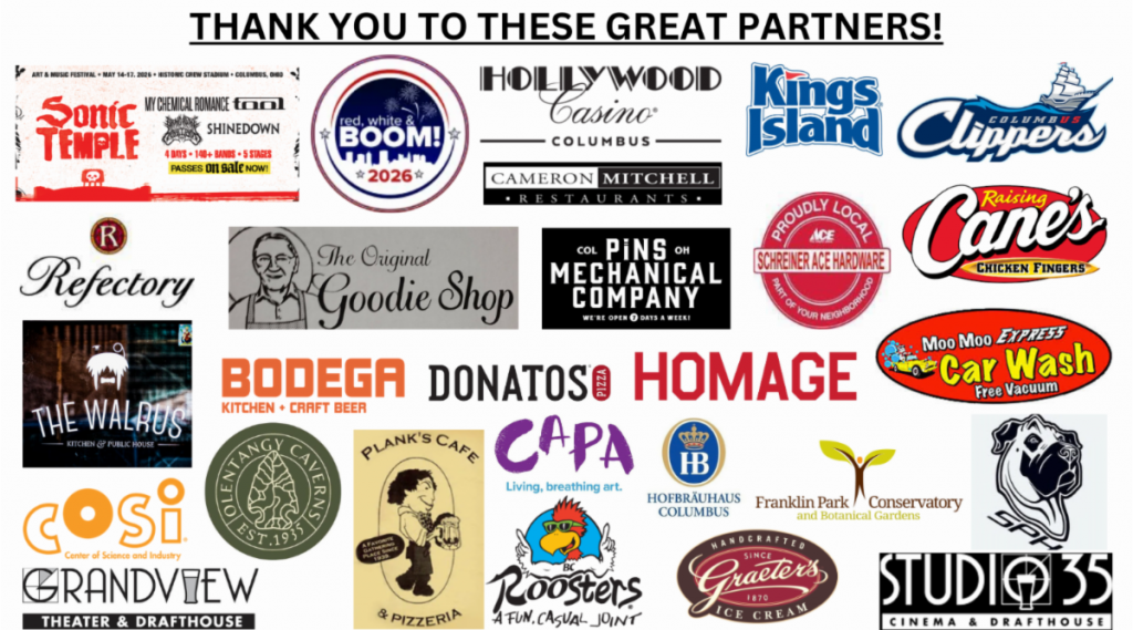 THANK YOU to Danny Wimmer Presents, Red White & BOOM, Hollywood Casino, Kings Island, Columbus Clippers, CAPA, Original Goodie Shop, Plank’s, The Walrus, HOMAGE, Refectory, Roosters, Bodega, COSI, Cane’s, Moo Moo Car Wash, Graeter’s, Franklin Park Conservatory, Schreiner’s Hardware, Studio 35, Grandview Theater, Olentangy Caverns, Shakers Public House, Donatos, Pins Mechanical Company, Columbus Piave Club, Cameron Mitchell Restaurants and Hofbrauhaus Columbus!